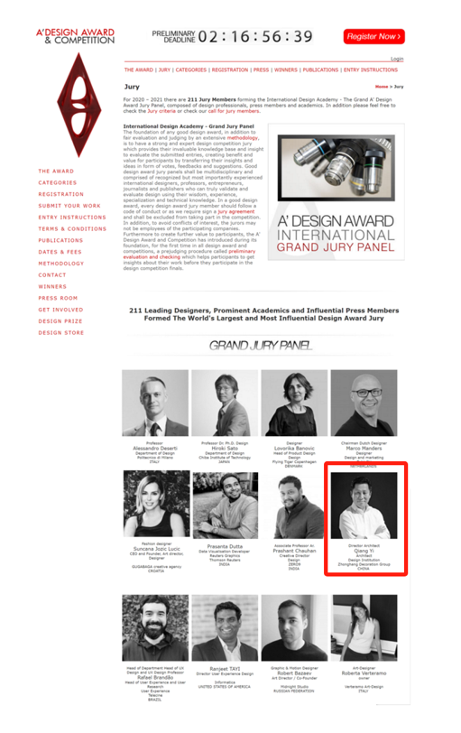 ? ? ? ?多年來他受邀擔(dān)任意大利A Design Award 設(shè)計大獎|國際評審、中國百強H.Design酒店設(shè)計大賽專家評審、中國建筑學(xué)會室內(nèi)設(shè)計獎|專業(yè)評委、深圳市住建局政府特聘|專家評委、中國未來空間設(shè)計大賽尋星獎|專家評委、中國祝融獎總決賽|專業(yè)評委等多個設(shè)計大賽的專業(yè)評審,其中2019至2023年連續(xù)五年受邀意大利A設(shè)計獎?chuàng)谓ㄖc室內(nèi)單元國際評委。